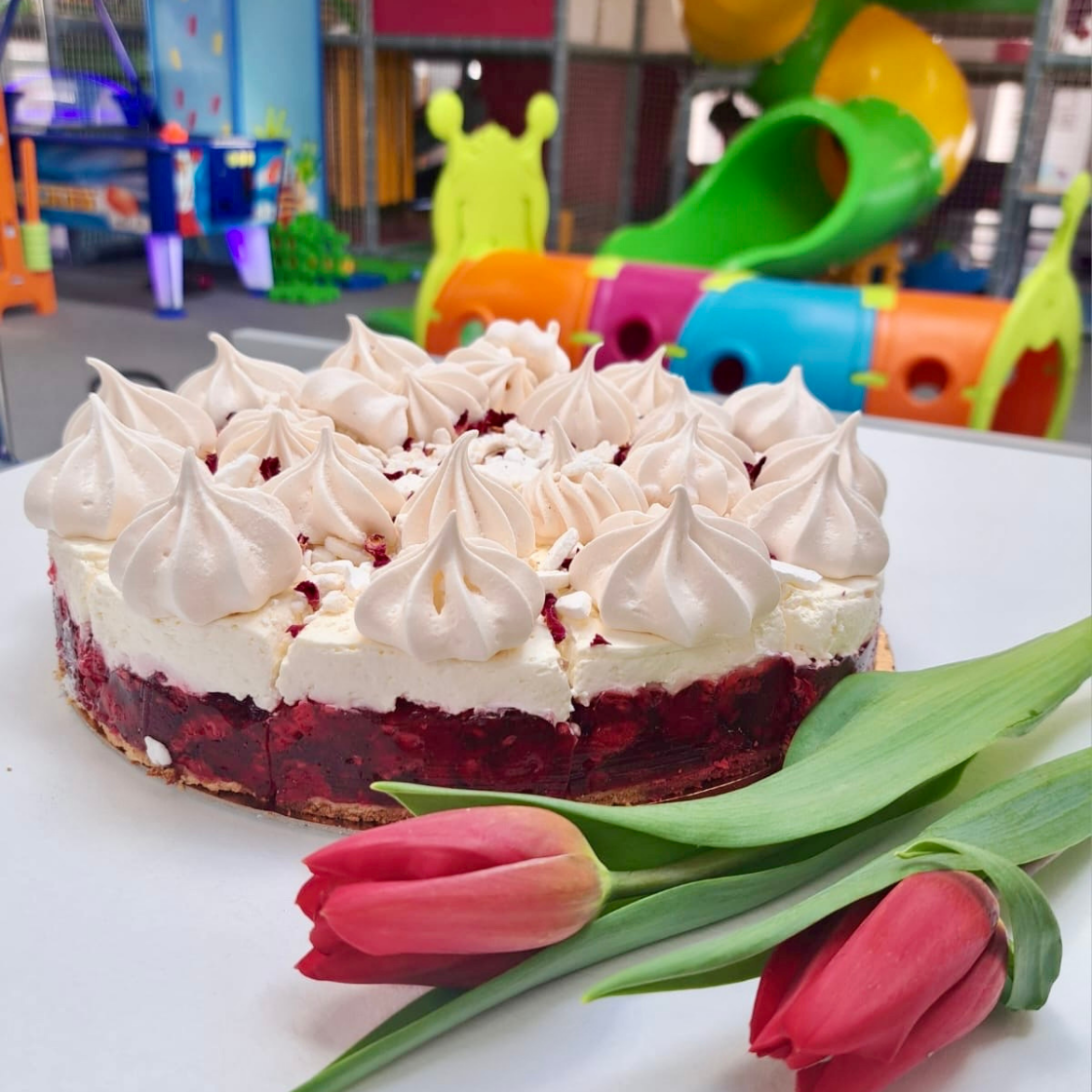 ciasta: sernik Hula Play, malinowa chmurka, sernik nowojorski, miodownik, brownie, bananofee, tort tiramisu, galaretkowiec, tarta z owocami, mini bezy Pavlova z owocami